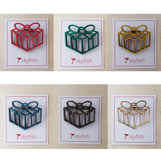 プレゼントボックス型の木製ブローチ(カラーバリエーション)