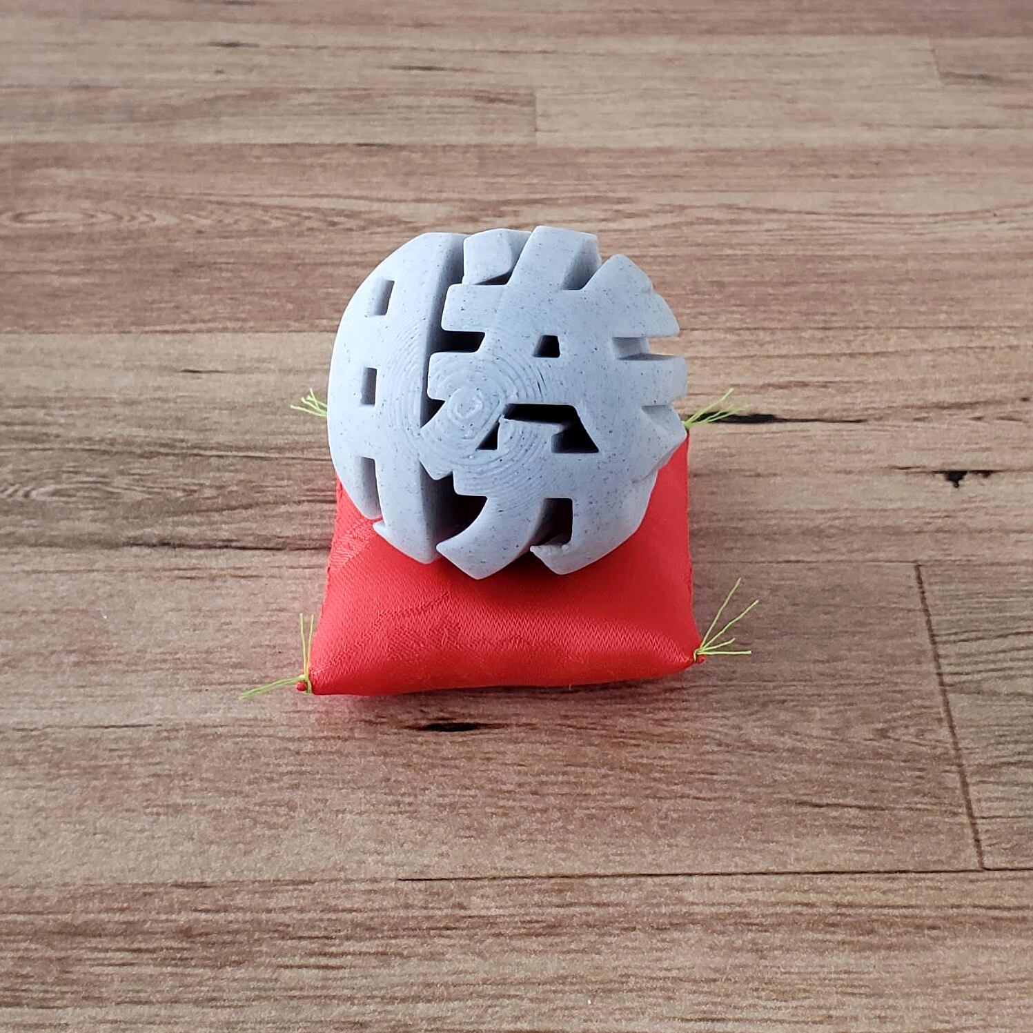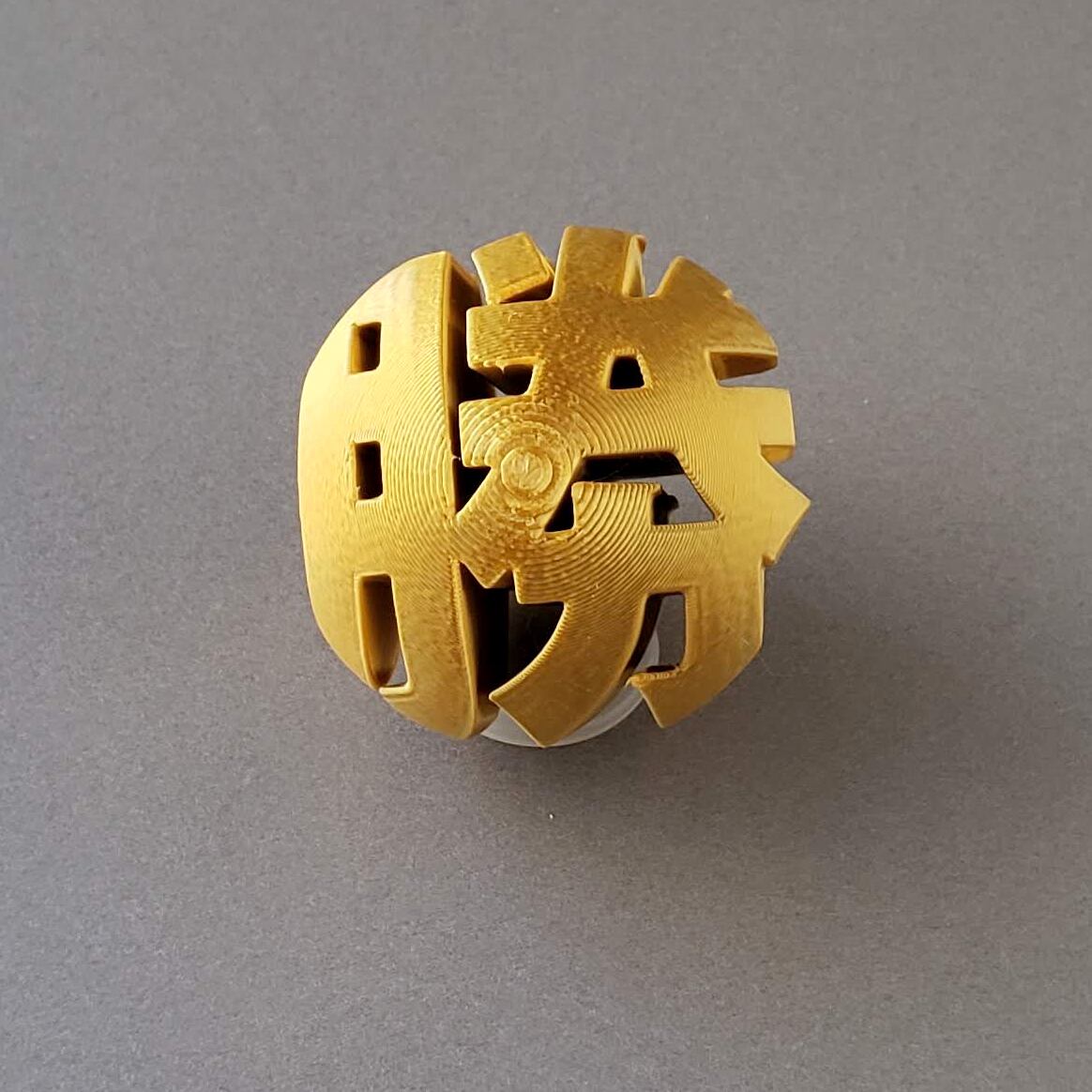 「勝」という文字を球体にしました。ご存じのように、勝ち、勝利など縁起の良い漢字です。