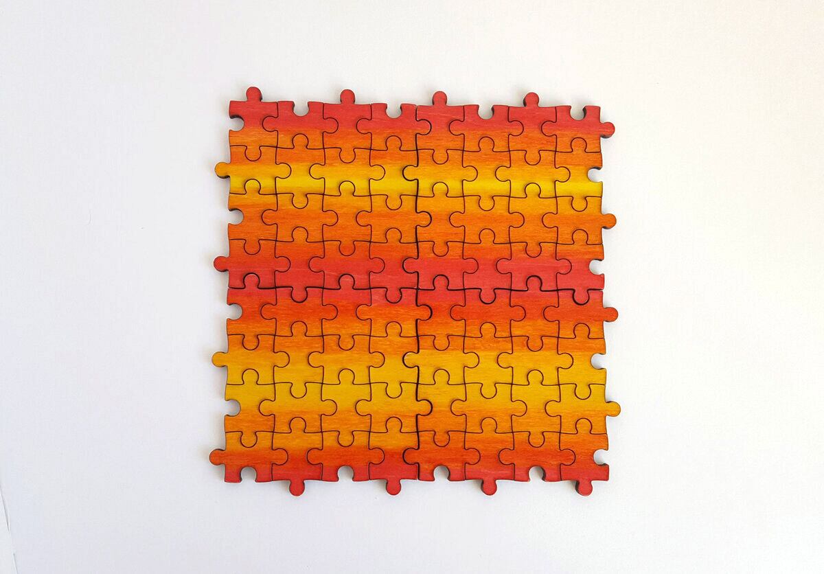 表面は、ピースの隙間をしっかり見せるため、レーザーによる焦げを残しています。手作りのため、グラデーションは毎回若干異なります。
